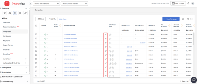 2. Access campaign settings: Choose a campaign and select the pencil/edit icon to edit the settings.