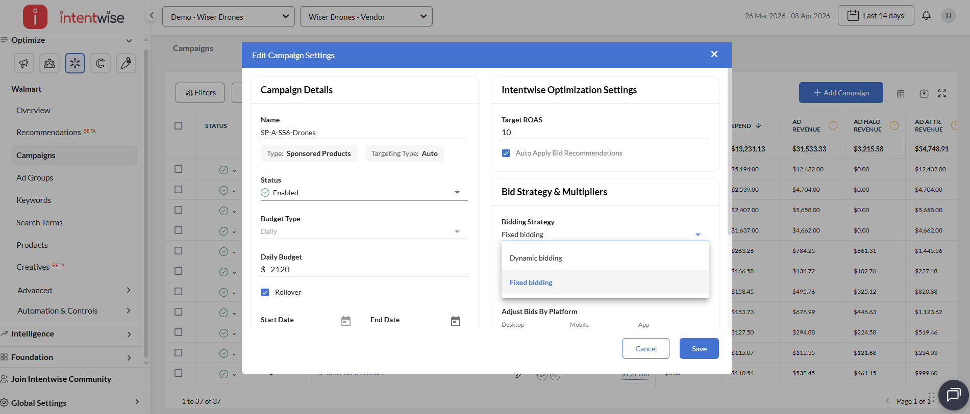 Dynamic bidding lets Walmart automatically adjust your bids in real time, increasing them by up to 100% or lowering them by up to 50% based on the likelihood of a purchase, without going below the minimum allowed for that campaign type. Fixed bidding keeps your bids exactly at the values you set, with no automated adjustments.