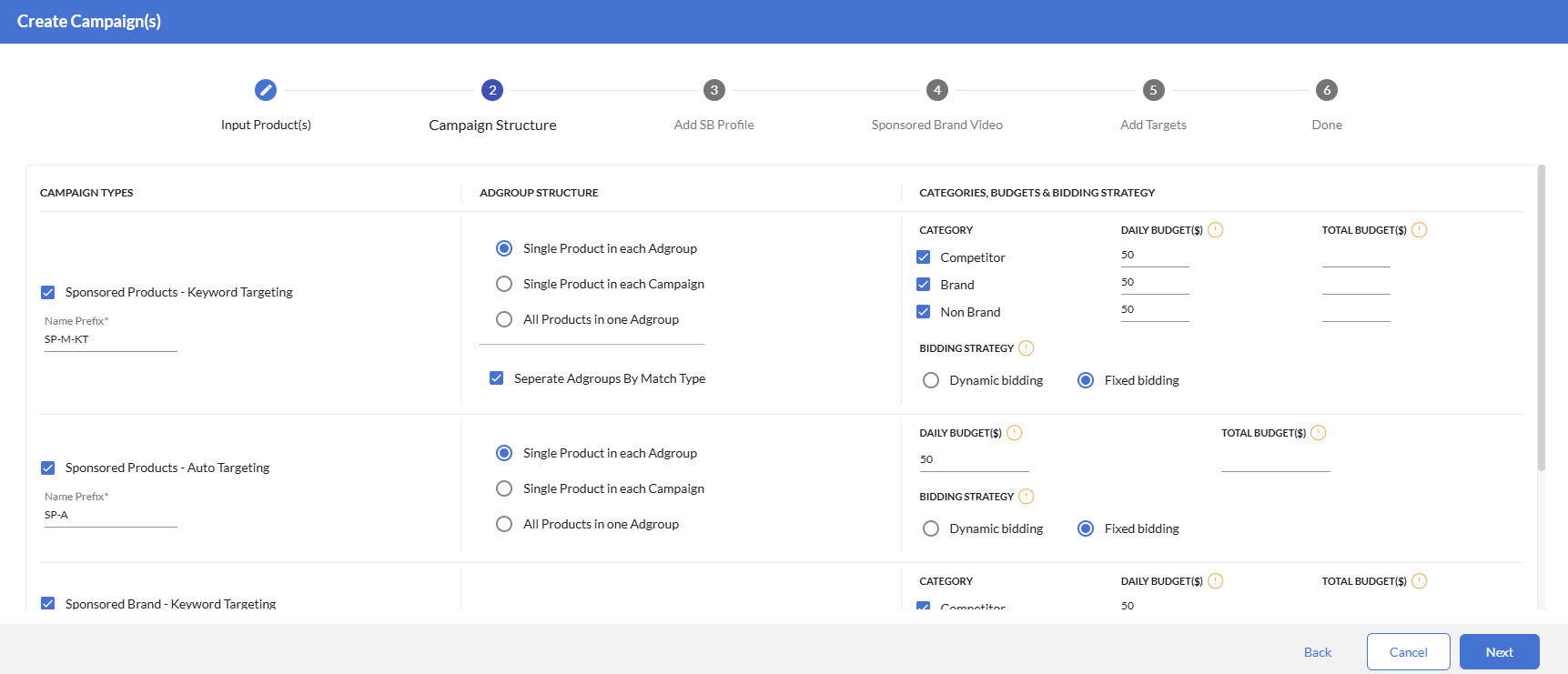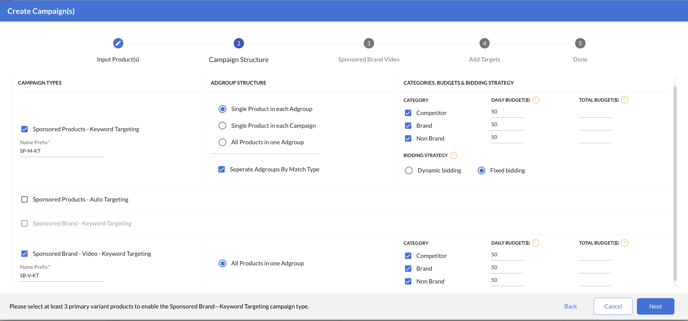 Select Categories (competitor, brand, or non brand), Budgets & Targets preferences, along with bidding strategy for sponsored products. Daily Budget minimums for 1P Sellers are $50 and $10 for 3P Sellers. Minimum Total Budget for 1P Sellers is $100, and $50 for 3P Sellers.
