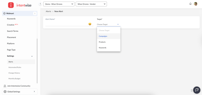 Name the alert and select the target, such as campaigns. There are three target types: