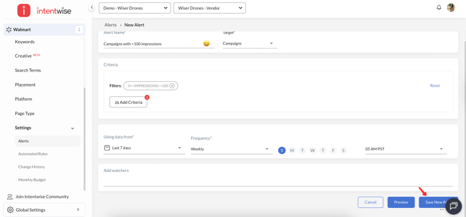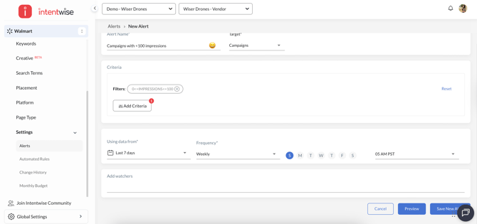 Set up alerts to monitor your advertising performance. In this article, you'll learn how to set an alert for Walmart:
