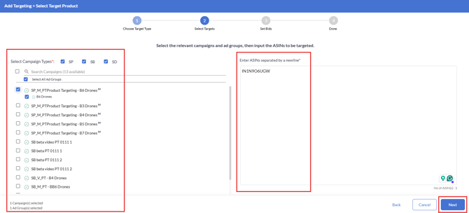 Select campaigns and ad groups and enter the ASINs to be targeted