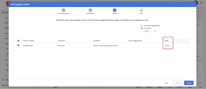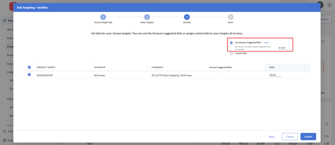 a. You can apply Amazon suggested bids. In the textbox, enter a default value when Amazon Suggested bid is unavailable for the target, and click Apply