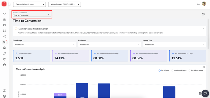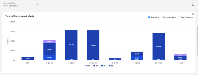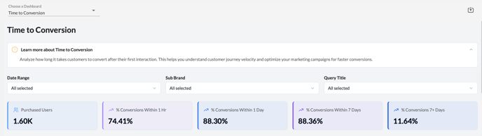 The Time to Conversion dashboard helps you analyze how long it takes customers to complete a purchase after their first interaction. This view is essential for understanding customer journey velocity and optimizing campaigns for faster conversions.