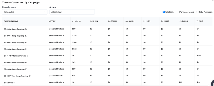 This helps you compare campaign efficiency — for instance, whether Sponsored Products convert faster than Sponsored Brands or DSP.